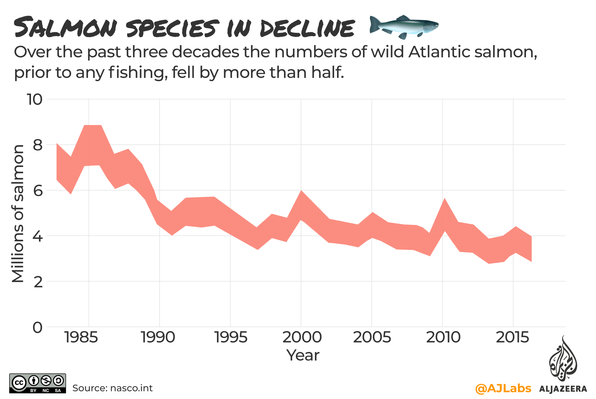 “In 1985 there were between eight to 10 million salmon in Atlantic waters and rivers,” said Mark Bilsby of the Atlantic Salmon Trust. “Now we estimate numbers of two to three million. They are the proverbial canary in the coal mine, telling us something is drastically wrong in our rivers and seas.”