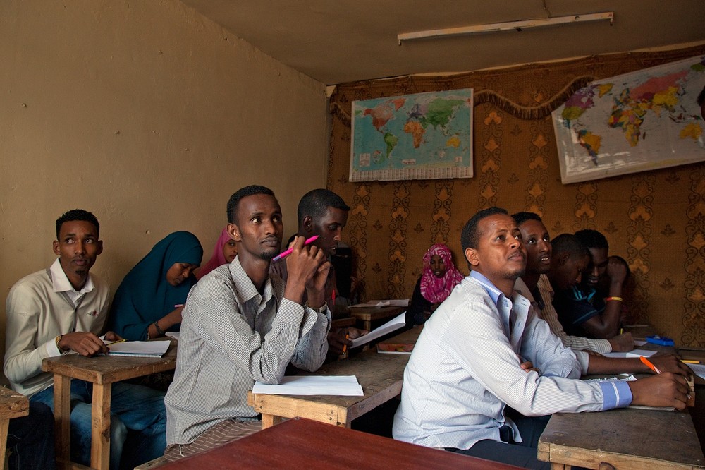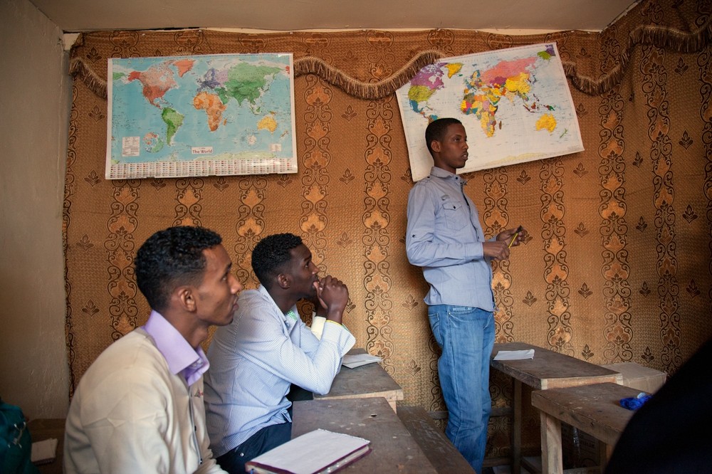 Ali sits toward the back, but takes notes carefully. His brother, working in the United States, sends him money to cover the monthly tuition fee of 1,000 shillings (US$12).
