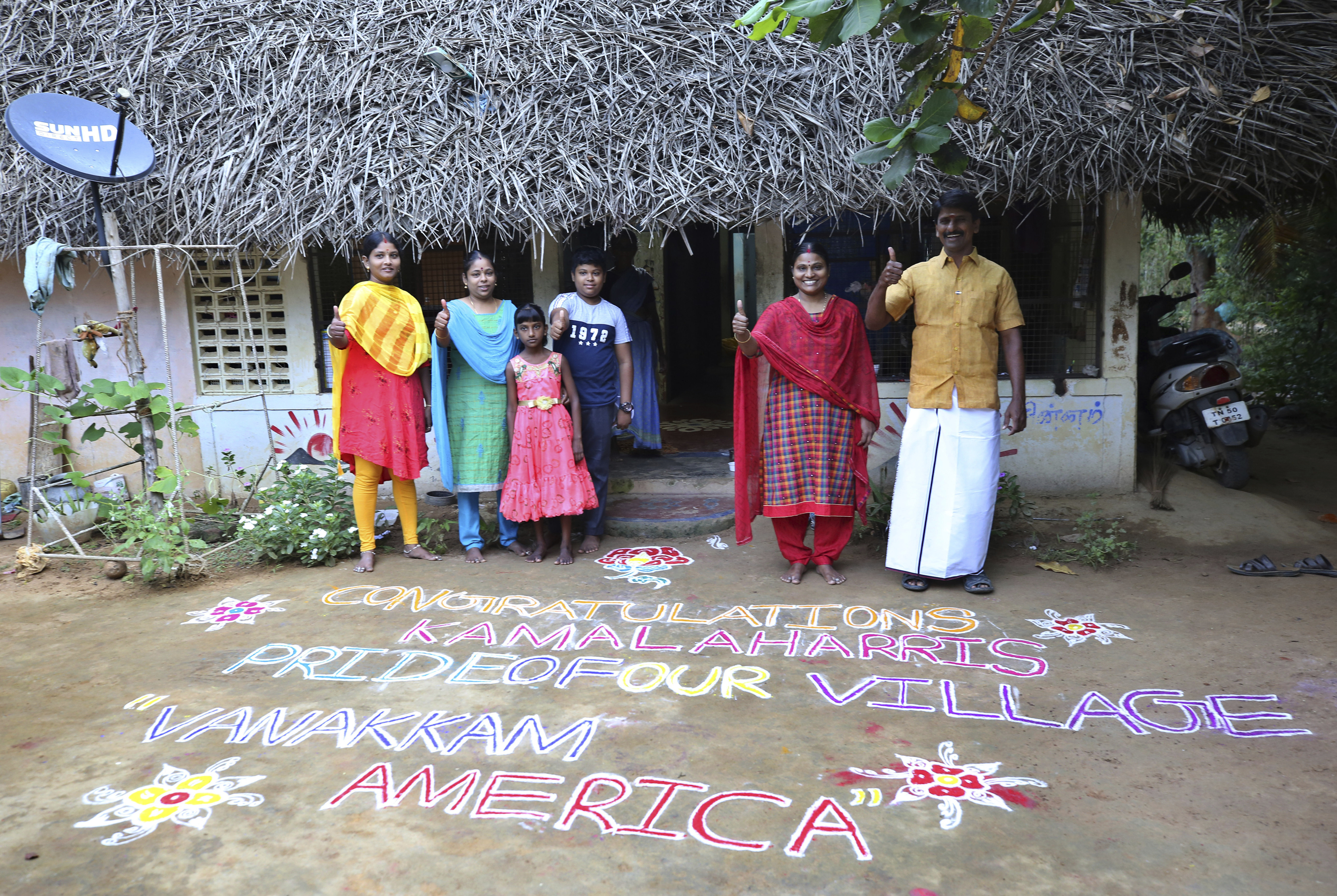 A woman wrote in coloured powder outside her home: “Congratulations Kamala Harris. Pride of our village. Vanakkam (Greetings) America.”
