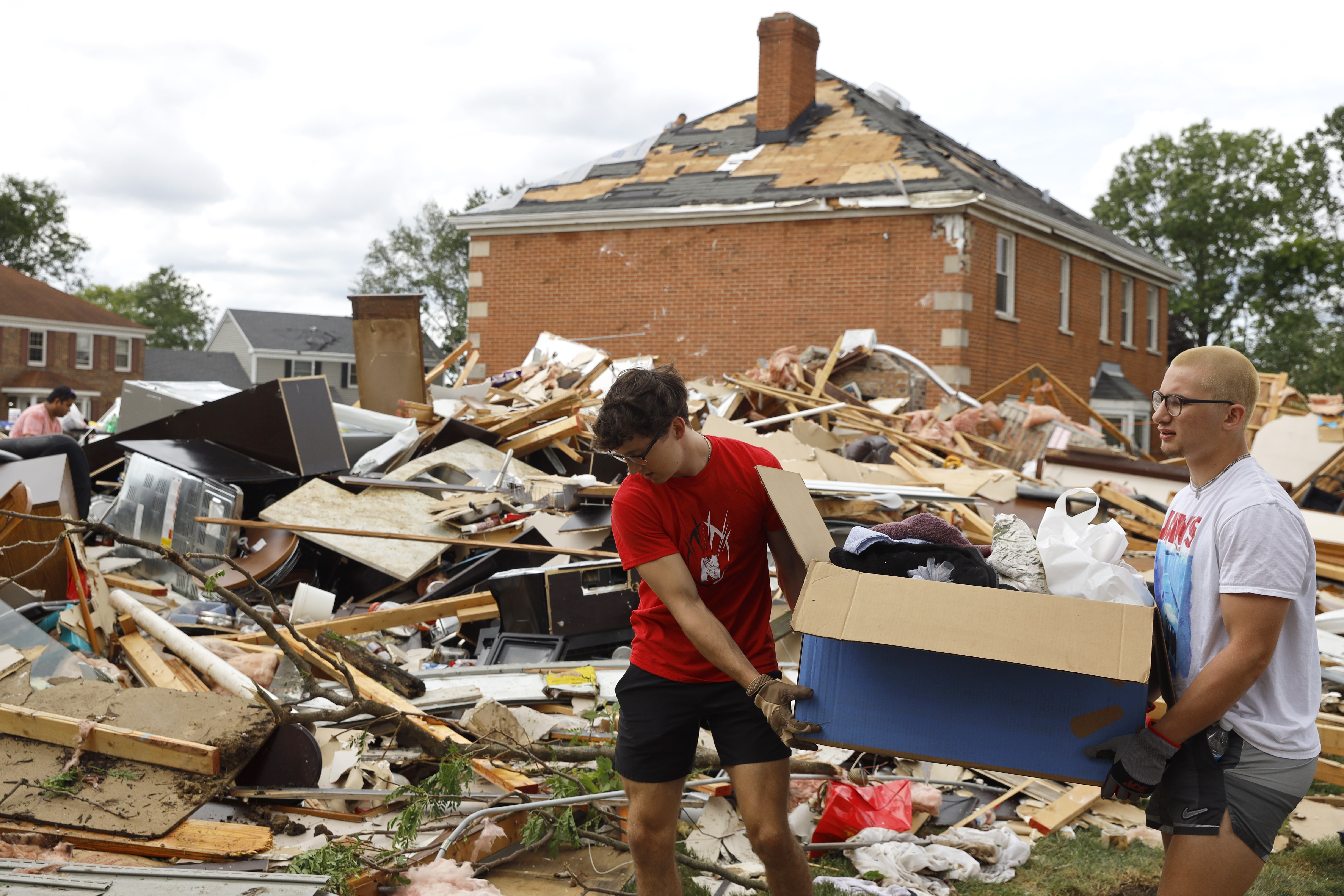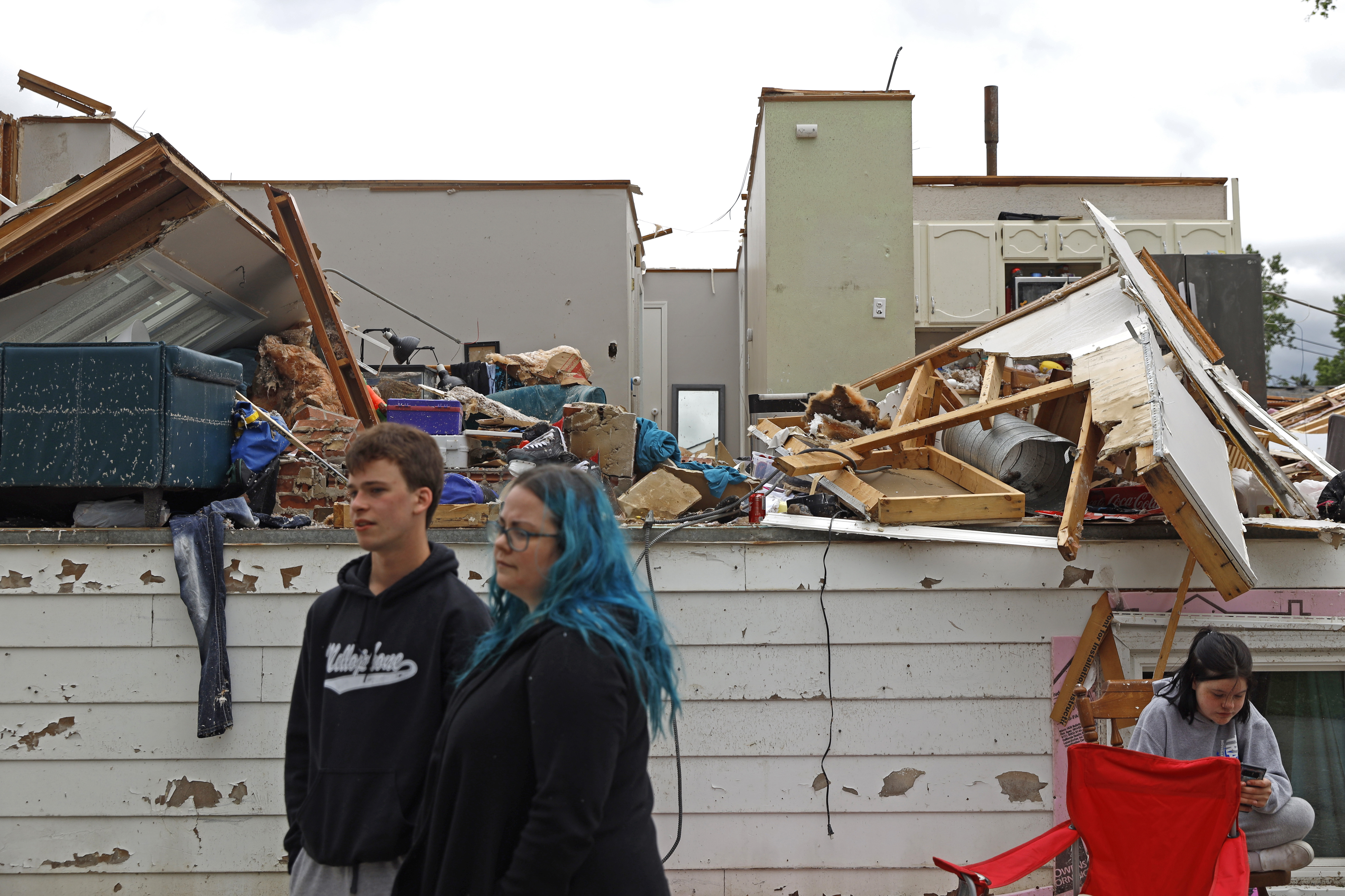The storm destroyed the second floor of Bridget Casey’s Woodridge home. She sat in a lawn chair in the driveway before sunrise Monday. Her 16-year-old son, Nate, said he was watching TV when the storm swept through and he raced to help his mother get his three younger siblings to the basement.