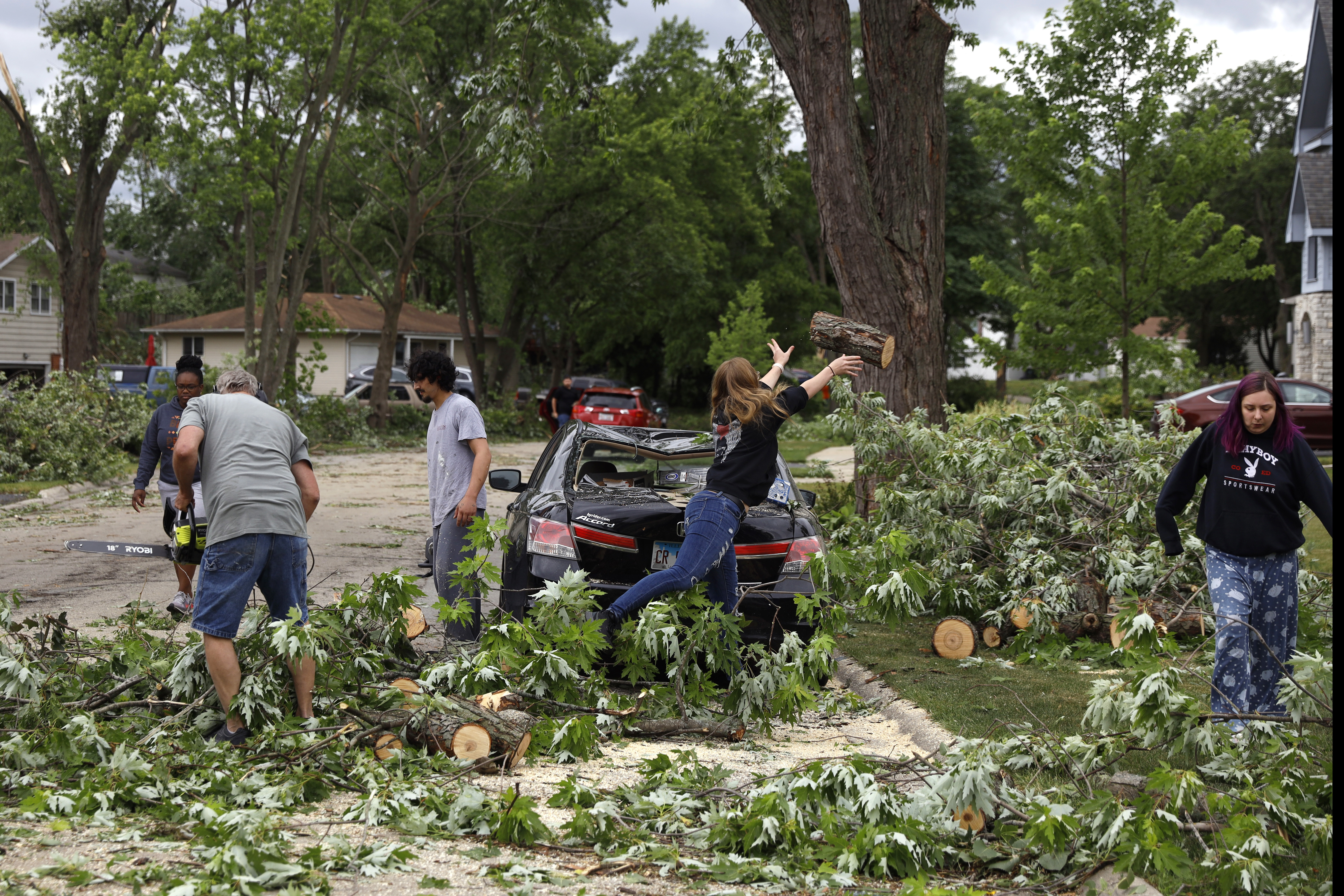The video showed several large trees downed and damage to homes and vehicles. Some gas leaks were reported in Naperville, and crews went door to door shutting off lines, LaCloche said.