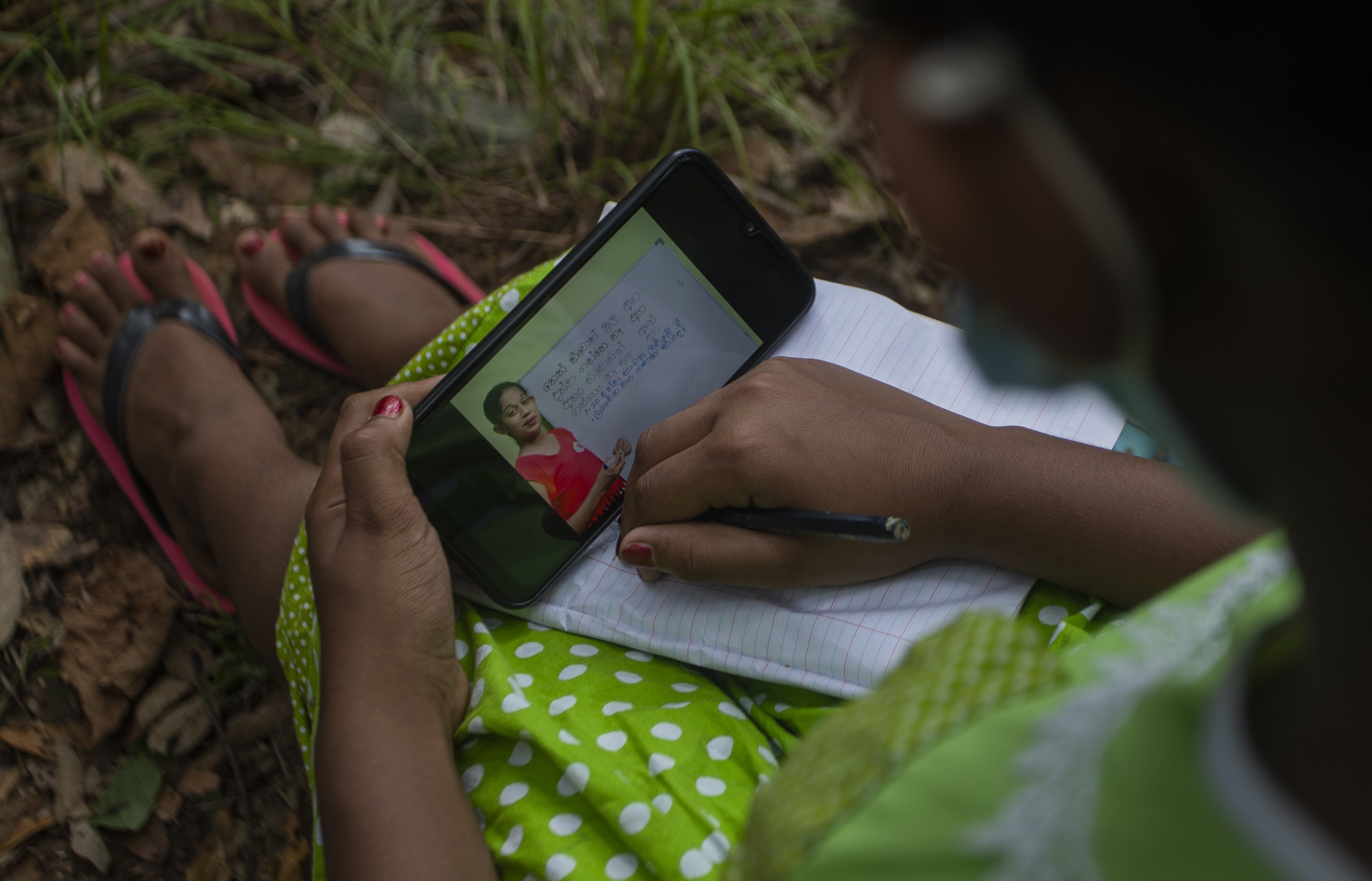 Information technology teacher Nimali Anuruddhika uses the signal to upload lessons for her students who have not been able to go to school because of the COVID-19 pandemic.