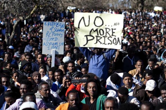 “Enough of racism!” they chanted, some of them waving Israeli flags, others holding up the Ethiopian flag. “In Europe they kill Jews because they’re Jews, here they kill Jews for being black,” read one placard.