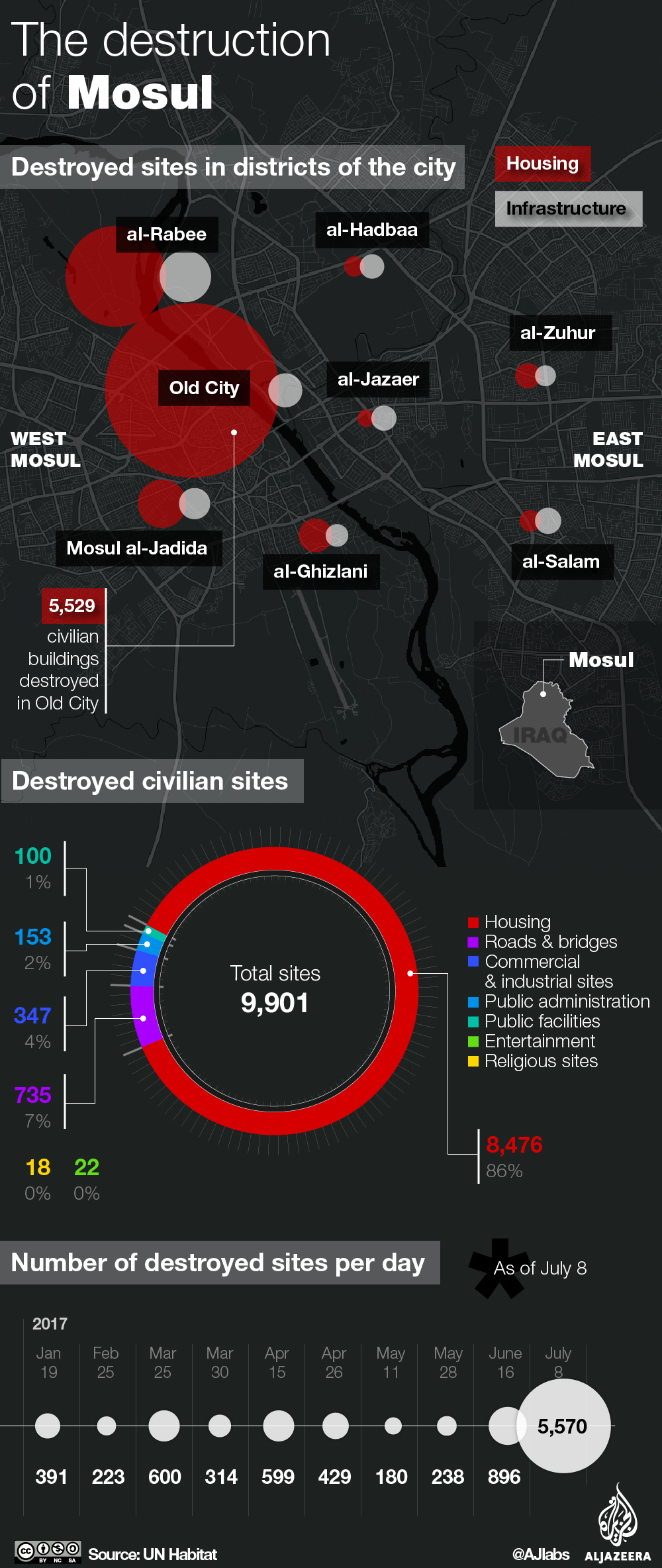Iraqi forces took the eastern side of Mosul from ISIL in January after 100 days of fighting and started attacking the western side in February. In April, the United Nations said the damage to houses were two-and-a-half times greater than in the eastern districts.