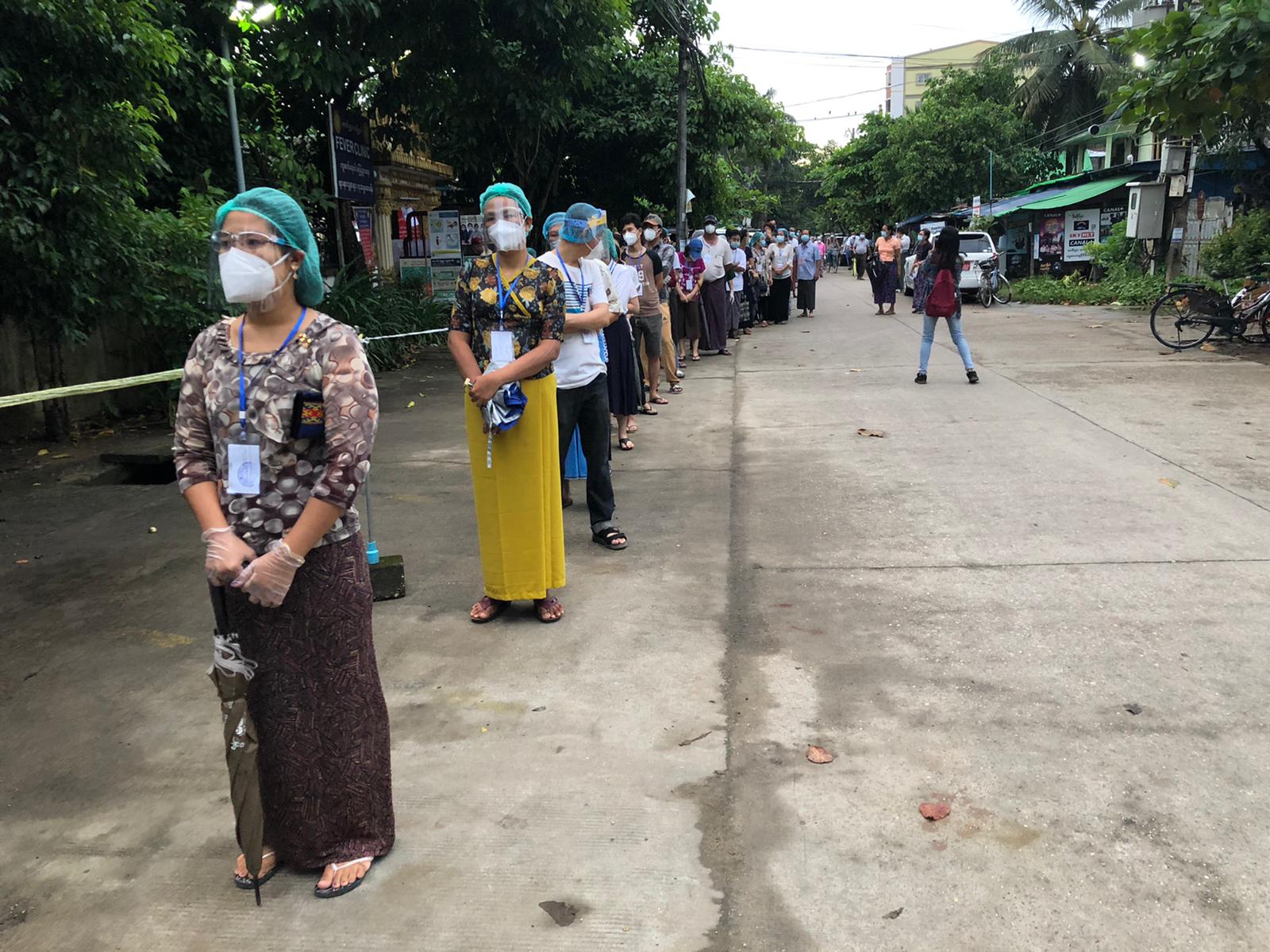 In South Okkalapa township in eastern Yangon, Myanmar’s biggest city, hundreds of voters – wearing masks, face shields and gloves – lined up outside a polling booth at dawn to cast their ballots.