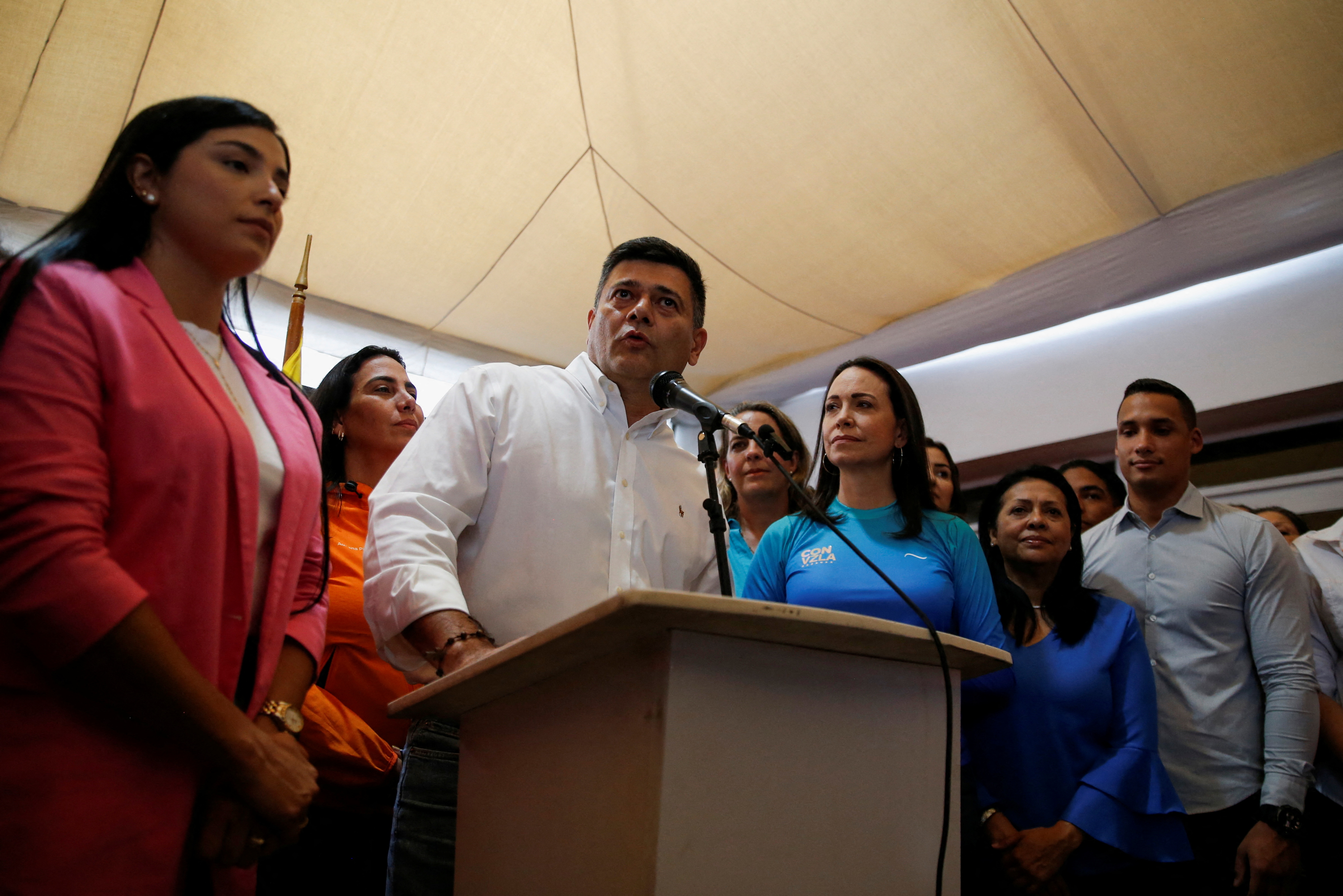 Freddy Superlano, leader of the Voluntad Popular party, speaks next to opposition leader Maria Corina Machado in Caracas in 2023 [Leonardo Fernandez Viloria/Reuters] - 30 Jul 2024 - 15:35(15:35 GMT)