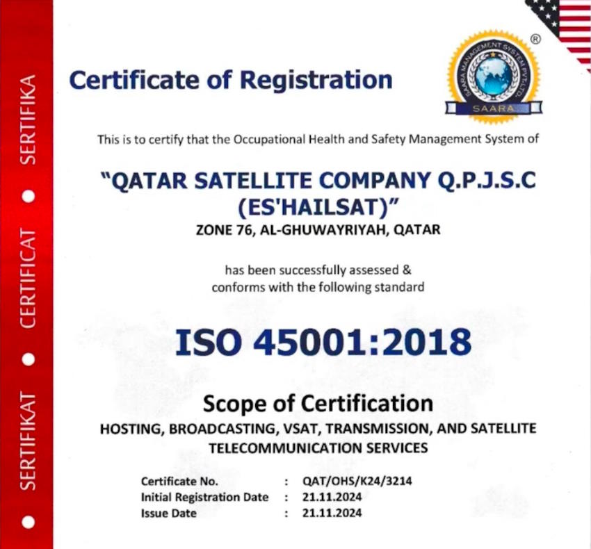 Furthermore, the Occupational Health and Safety Management System of Es’hailSat’s Teleport was also successfully assessed and awarded with the ISO 45001:2018 certification which covered hosting, broadcasting, VSAT, transmission and satellite telecommunication services offered from the state-of-the-art facility.